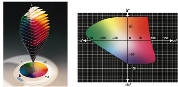 Цвет и точность цветопередачи меряется в Lab. Есть специальные координаты – некие значения, которые описывают любой цвет. Цветовое пространство Lab можно визуализировать следующим образом: