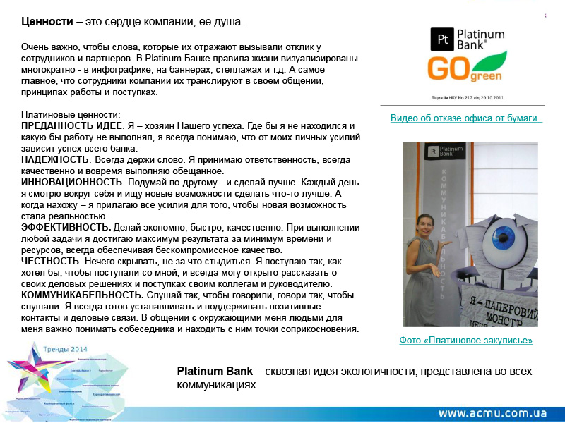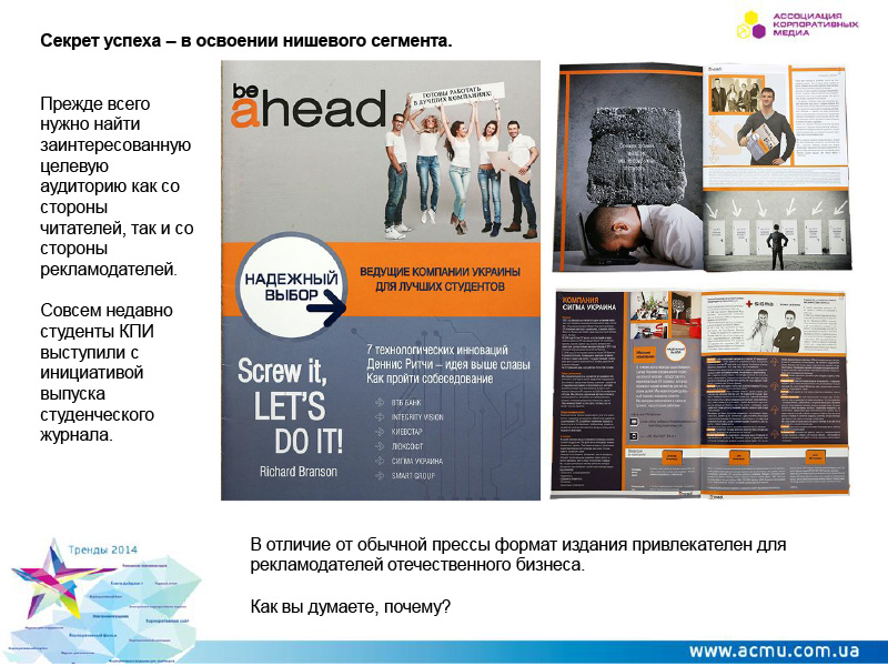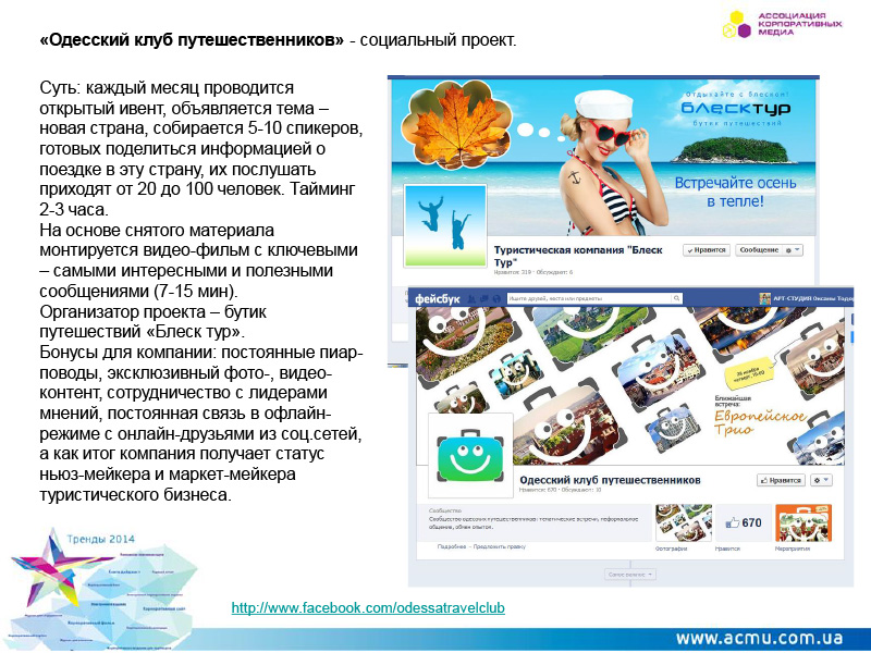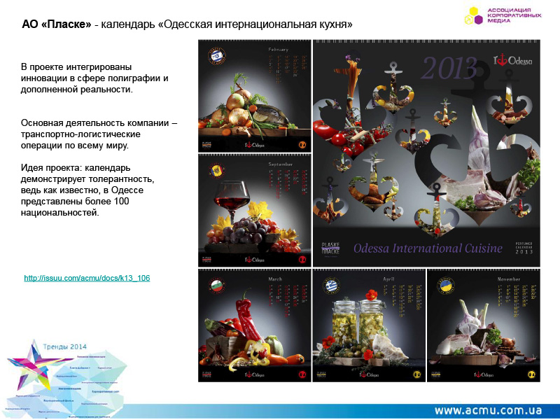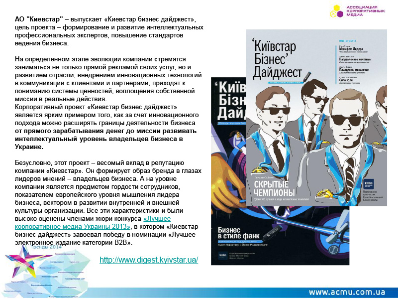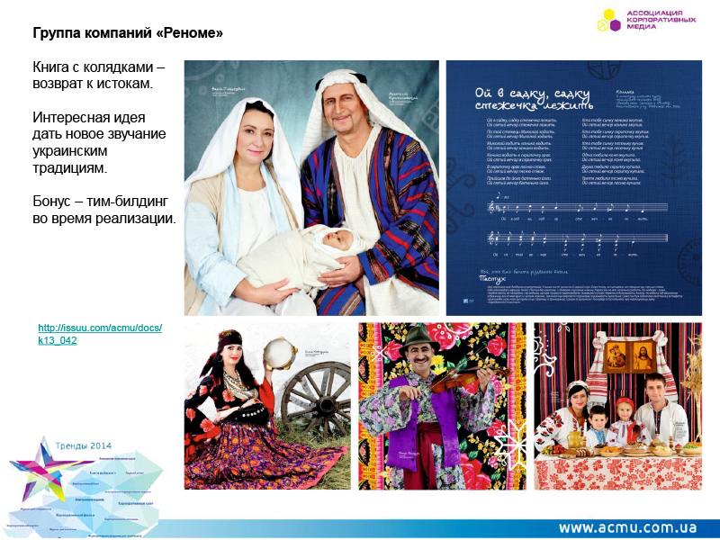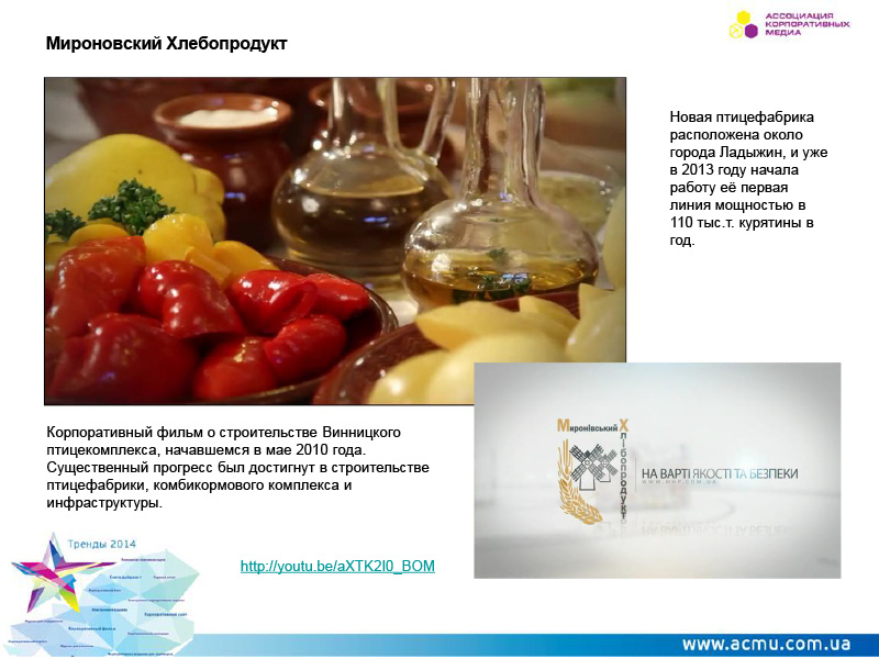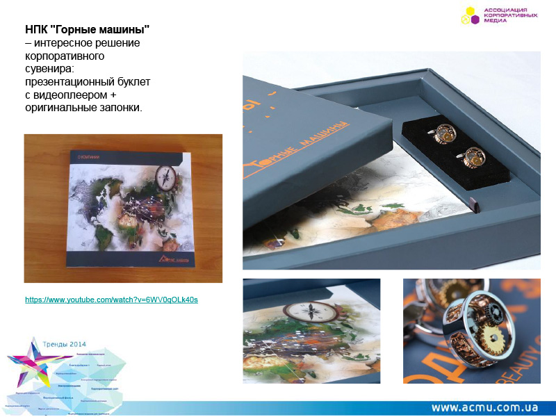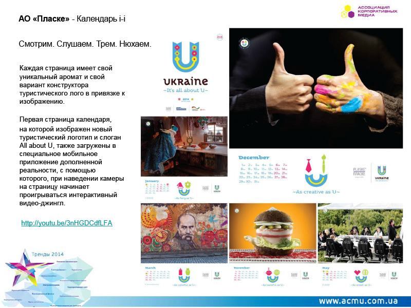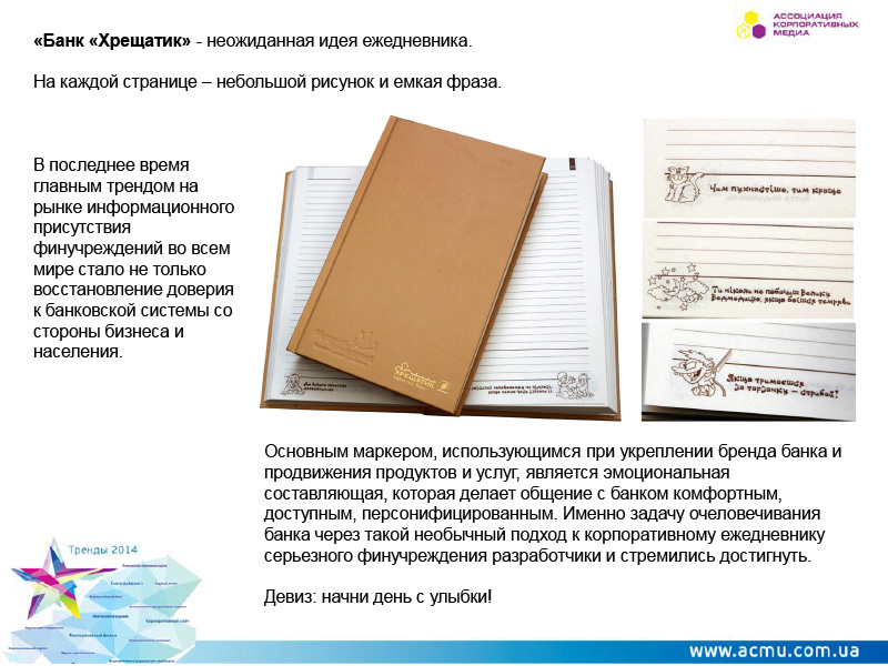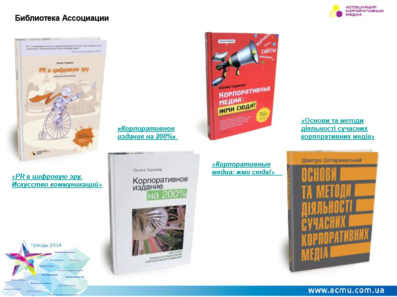 презентации "ТОП10 идей для корпоративных медиа", представленной президентом Ассоциации корпоративных медиа Украины - Оксаной Тодоровой, были рассмотрены кейсы участников конкурса «Лучшее корпоративное медиа Украины».
