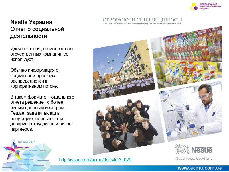 презентации "ТОП10 идей для корпоративных медиа", представленной президентом Ассоциации корпоративных медиа Украины - Оксаной Тодоровой, были рассмотрены кейсы участников конкурса «Лучшее корпоративное медиа Украины».