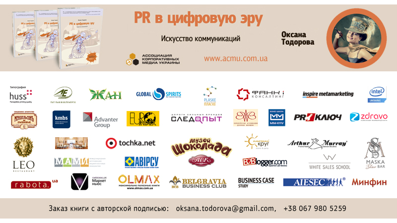 Для заказа книги Оксаны Тодоровой «PR в цифровую эру. Искусство коммуникаций», отправьте письмо на адрес oksana.todorova@gmail.com или позвоните по тел. +38 067 980 5259