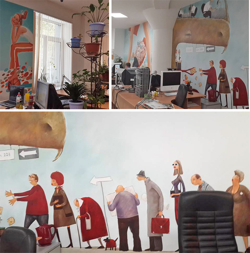 Здесь трудятся 17 талантливых сотрудников. Занимаются дизайном, есть своя фотостудия. Просторно. Стены в кабинетах расписаны стрит-артом. Творчество буквально висит в воздухе...
