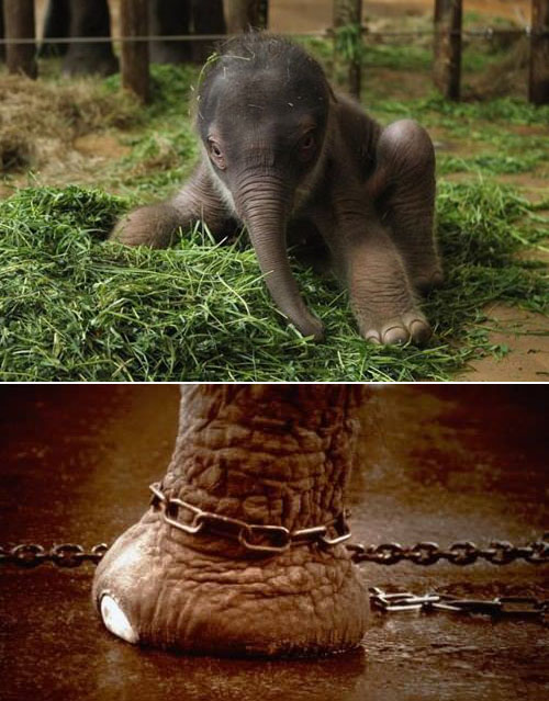 А история такая. Когда слона хотят приручить, его берут в саааамом нежном и юном возрасте и привязывают на цепь к стволу крепкого дерева. Слоник пытается вырваться, но цепь и дерево не пускают. Слоник подрастает, дерево подбирают покрупнее, помассивней. Слоник снова повторяет попытки освободиться. Но цепь и дерево оказываются гораздо сильнее. Так, день за днем, год за годом он изучает правило: «У тебя ничего не получится!» В конце-концов, уже взрослого и «поумневшего» слона привязывают к мааааленькому колышку за тооооненкую веревочку. И слон, который мог бы разнести вдребезги любой цирк, стоит послушный, с «пониманием»: «Нечего тратить силы, стой, кушай и слушайся!»