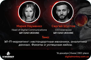 16 декабря в рамках конференции по цифровому маркетингу Digital Monkey эксперты в области альтернативных методов продвижения – Сергей Шустов и Марина Науменко – расскажут о том, как превратить точку доступа Wi-Fi в рекламную площадку.